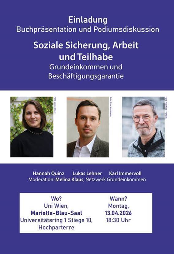 Am 21.2.2024 stellten sich in der Buchhandlung FAKTory (ehem. ÖGB-Buchhandlung) die Sozial- und Arbeitswissenschafter Nikolaus Dimmel von der Uni Salzburg und Jörg Flecker von der Uni Wien, gemeinsam mit dem Grundeinkommensexperten und ehem. Betriebsseelsorger Karl A. Immervoll der Diskussion. Die Politikwissenschafterin Margit Appel, selbst Autorin zahlreicher Grundeinkommenspublikationen, moderierte die Buchpräsentation, sowie die Anfragen aus dem Publikum zu beiden Modellprojekten.